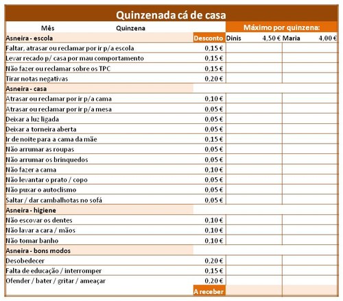 Sim, as crianças e jovens devem aprender que o dinheiro não está sempre garantido, e que asneiras e maus comportamentos têm penalizações. Desta forma a criança percebe que fazer a coisa certa é uma obrigação e fazer a coisa errada produz consequências negativas. Por isso, e à semelhança de um pai brasileiro que postou uma grelha com as regras da mesada dos seus filhos, e se tornou num caso viral *, eu também criei a grelha da quinzenada lá de casa: