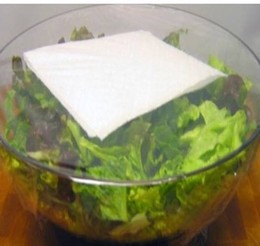 3) Por cima da alface coloque uma folha de papel de cozinha